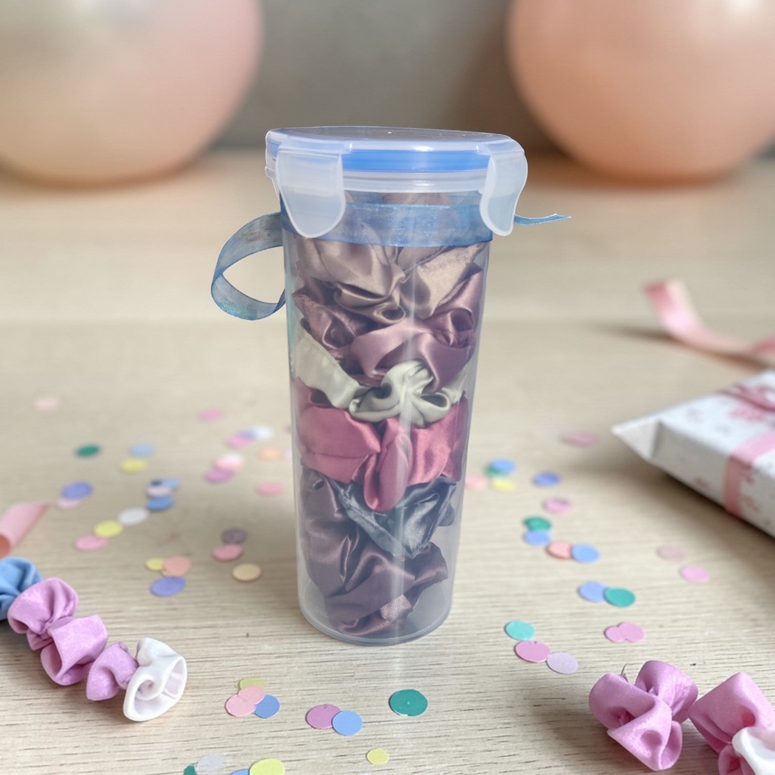 The Berry Scrunchie Birthday Hamper features a curated set of soft satin scrunchies in rich berry-inspired shades. Packed inside a reusable gift tumbler and finished with a cute birthday tag, it’s a thoughtful little gift that feels special and fun to open.