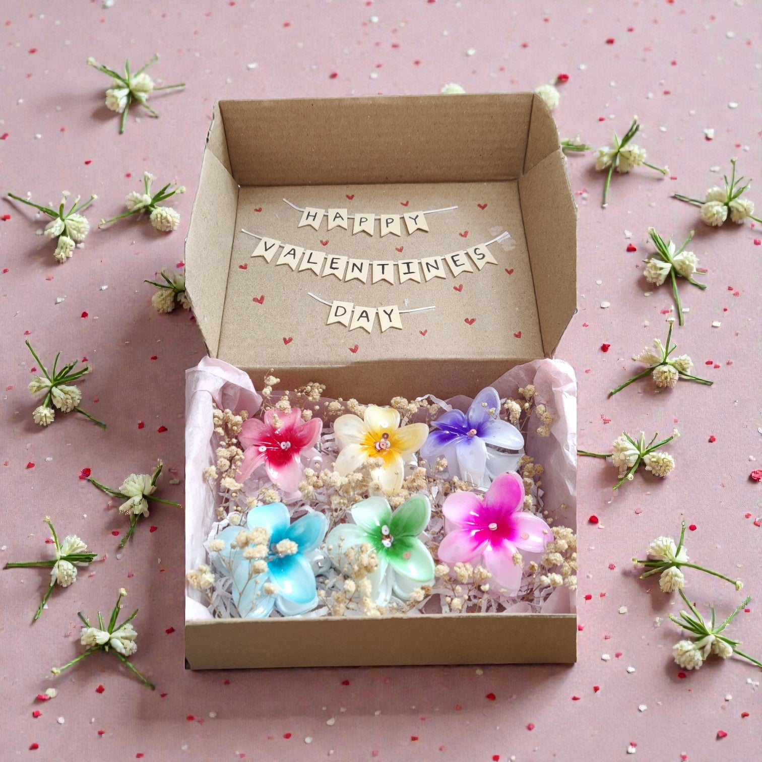 Inside, you’ll find a charming arrangement of six elegant claw clips in different colours, nestled among soft baby’s breath florals and finished with a “Happy Valentine’s Day” banner for that extra heartfelt touch. Each element is chosen to feel useful, aesthetic, and effortlessly special.