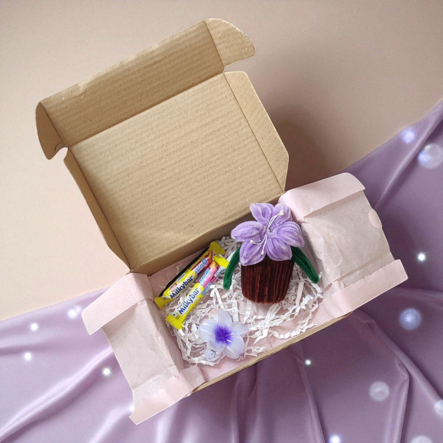 Celebrate her calm and classy vibe with “Lavender Love” – a soothing curation featuring a purple lily pot, floral claw clip, and two sweet treats. Perfect for anyone who embodies elegance and ease, this gift box brings charm in every shade of lilac.