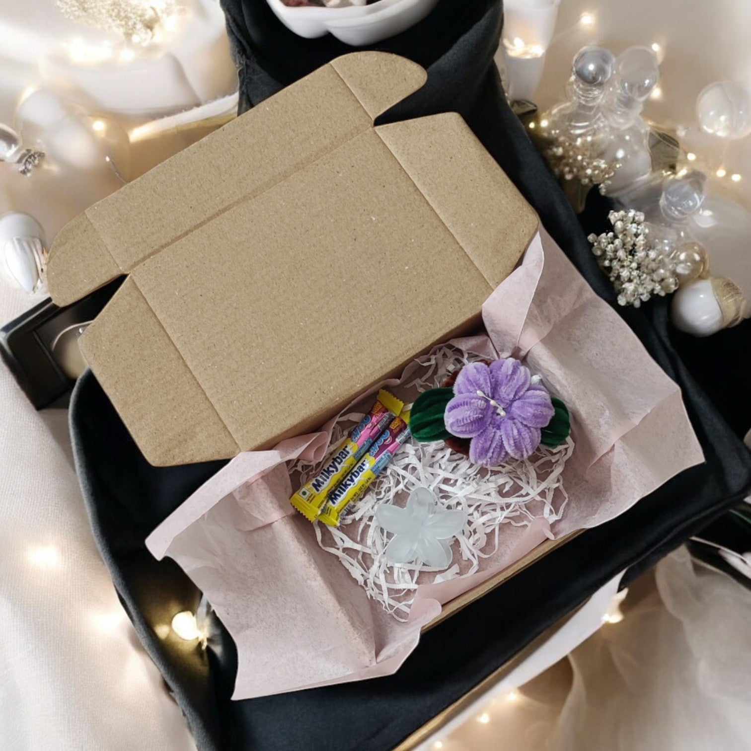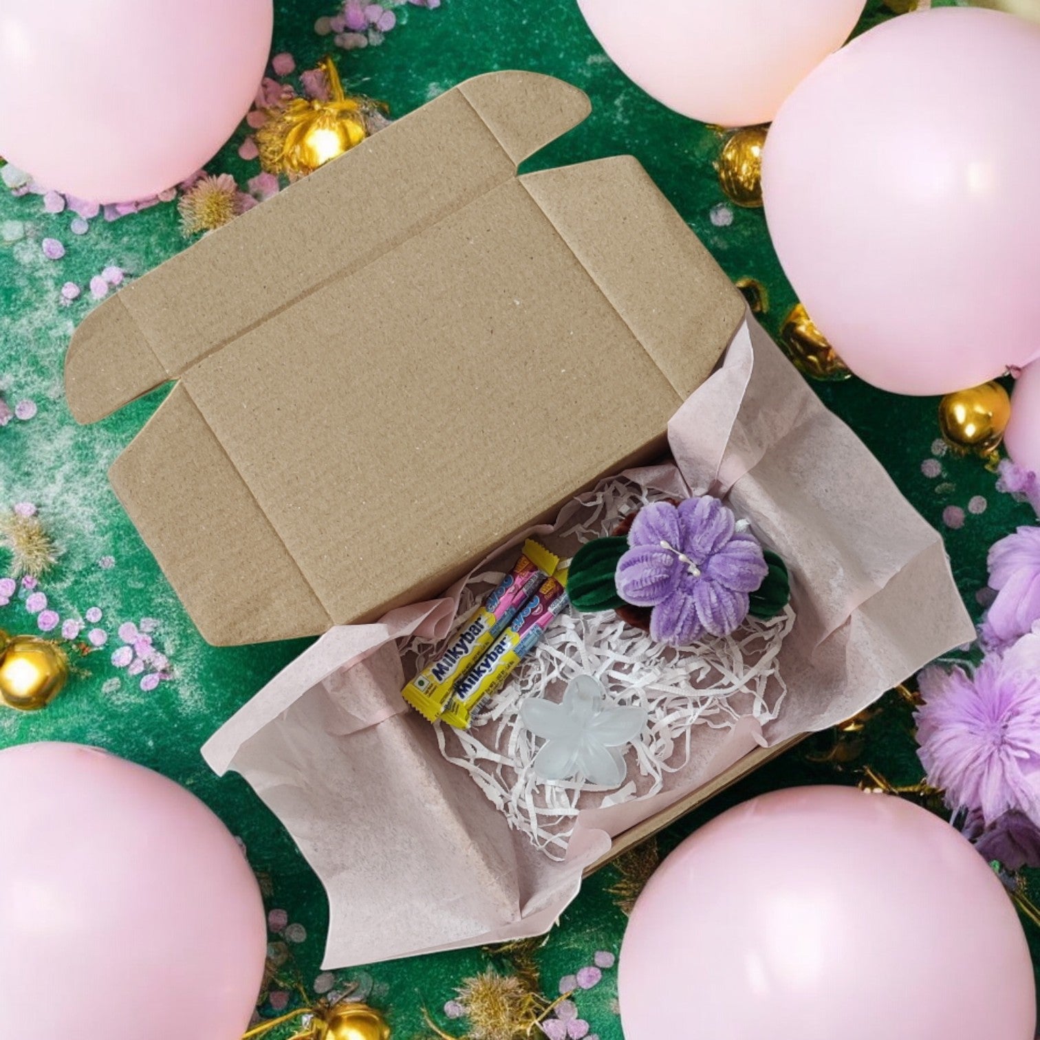 Celebrate her elegance with “Lilac Love” – a thoughtfully curated gift featuring a mini purple lily pot, floral hair clip, and two sweet treats. A soft, graceful bundle perfect for anyone who loves a touch of calm and charm in their space.